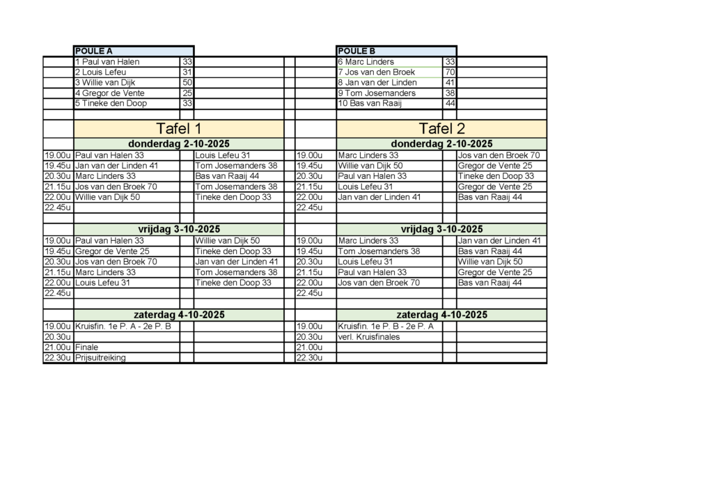 De kruisfinales op Zaterdag 4 oktober zullen gaan tussen Gregor de Vente en Marc Linders en tussen Jos van den Broek en Wilie van Dijk. De kruisfinales starten om 19.00 uur. Nadien volgt eerst de troostfinale om de derde en vierde plek en daarna om ± 21.15 uur uur de finale gevolgd door de prijsuitreiking. Het kan met deze vier kampioenen nog alle kanten op, dus dat word zeker weer genieten voor alle toeschouwers,